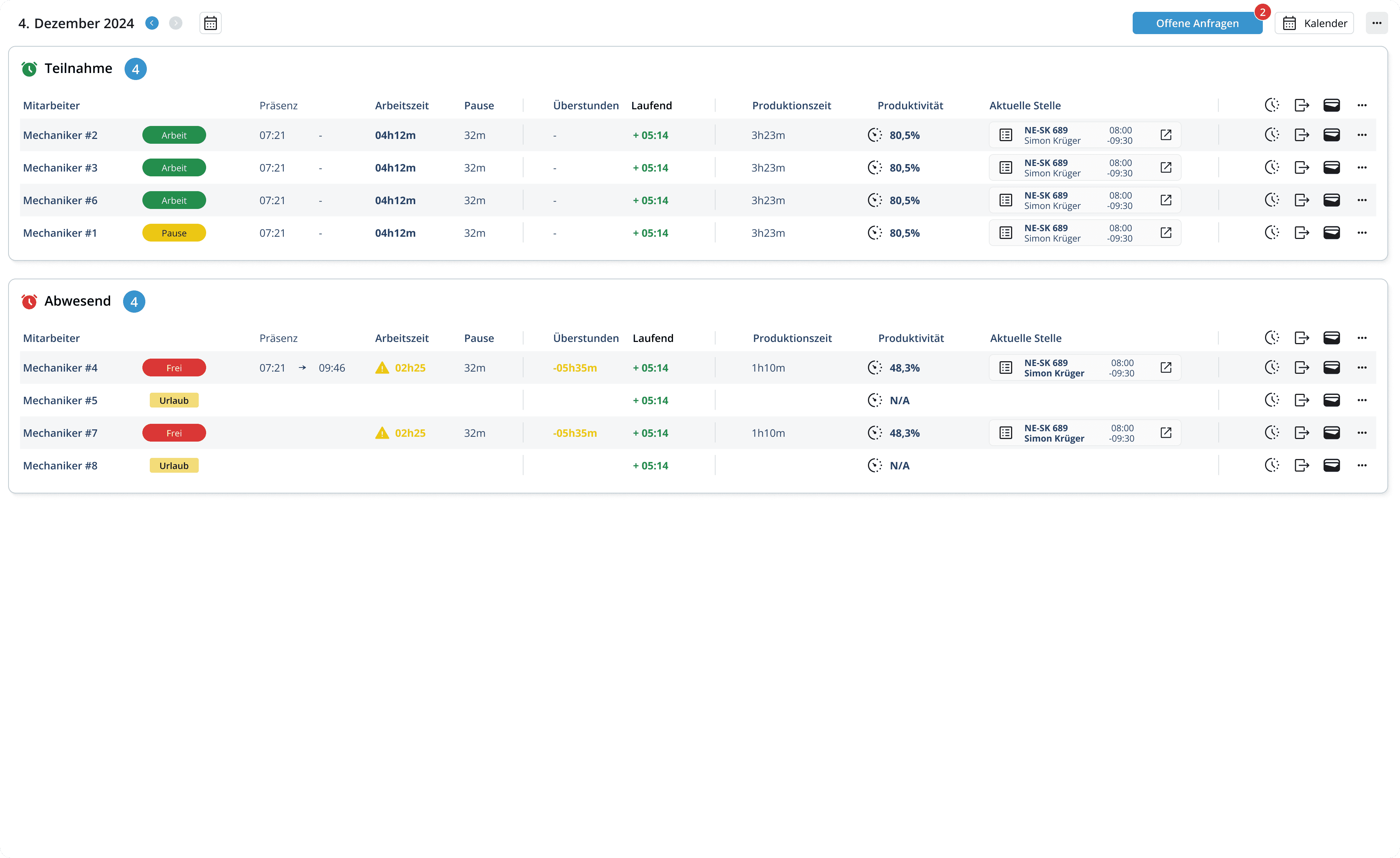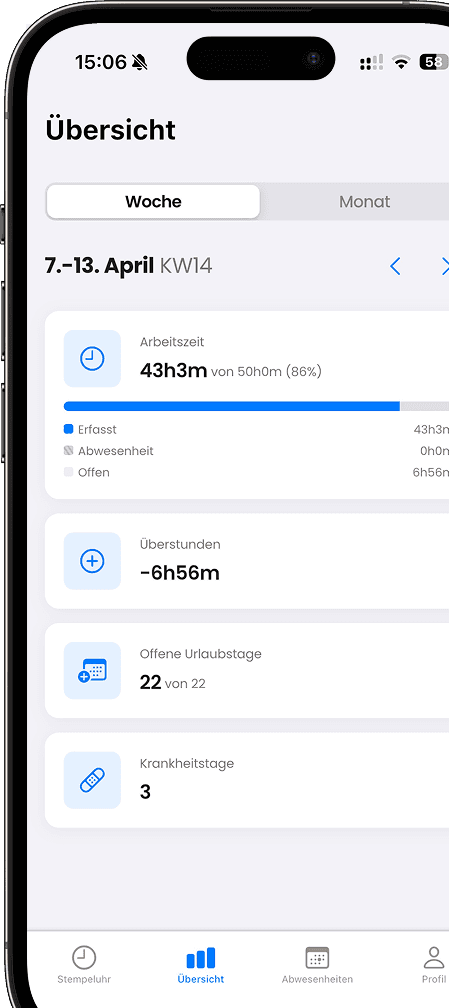 Die integrierte Zeiterfassung der Zeitmechanik sorgt dafür, dass deine Mitarbeiter ohne Systemwechsel ihre Arbeitszeit erfassen können. Kein Anstehen am Terminal, keine separaten Login-Daten für fünf verschiedene Systeme - einfach alles in einem System.
